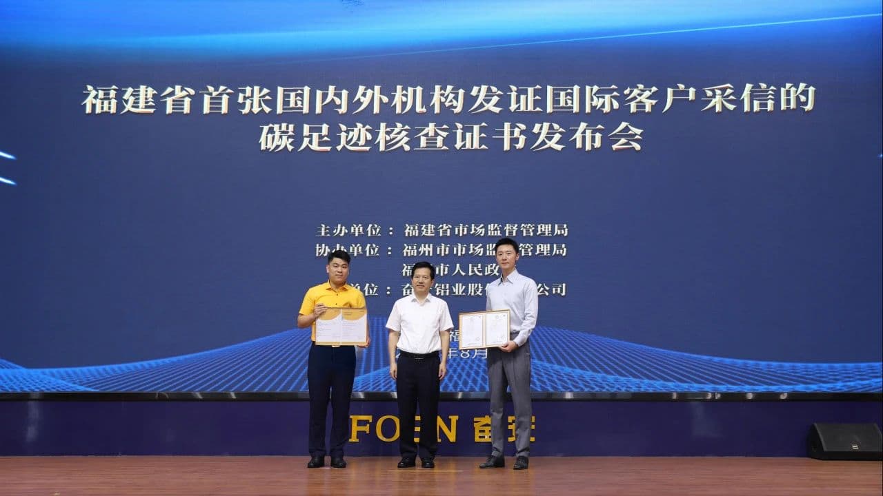 في 19 أغسطس، مُنحت رسميًا أول شهادة للتحقق من البصمة الكربونية في مقاطعة فوجيان، صادرة عن هيئات اعتماد محلية وأجنبية ومعترف بها من قبل عملاء دوليين، في شركة FOEN للألمنيوم المحدودة. وحضر الحفل عدد من القادة، منهم هوانغ شويمو، سكرتير مجموعة قيادة الحزب ومدير إدارة تنظيم سوق مقاطعة فوجيان؛ وتشن زونغشينغ، سكرتير مجموعة قيادة الحزب ومدير إدارة تنظيم سوق فوتشو؛ ولين هيزي، نائب عمدة مدينة فوتشينغ. كما حضر الحفل هوانغ فن، رئيس مجلس إدارة شركة FOEN للألمنيوم المحدودة، بالإضافة إلى مسؤولين من إدارات تنظيم سوق المقاطعة ومعهد فوجيان الإقليمي للمقاييس، وممثلين عن مجموعة شهادات علامة الجودة الصينية وشركة Intertek Testing Services (Shanghai) المحدودة.