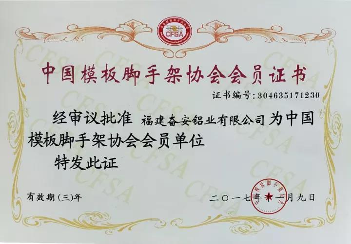 جمعية الصين للقوالب والسقالات (CFSA) هي منظمة تجارية وطنية وجمعية وطنية من المستوى الأول. الشركات الأعضاء في الجمعية رائدة في صناعة القوالب والسقالات المحلية. بتوجيه من الجمعية الصينية للقوالب والسقالات، فوين سيتعلمون من بعضهم البعض ويتحسنون جنبًا إلى جنب مع الأعضاء الآخرين في الجمعية لتوسيع مفهوم الحفاظ على الطاقة والتنمية الخضراء إلى مجال الهندسة المعمارية بأكمله، والعملية بأكملها، والسلسلة الصناعية بأكملها.