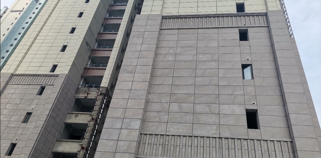 (1) حائط ستارة حجري من النوع المعلق: حائط ستارة يربط الحجر والإطار باستخدام المعلقات الجافة الحجرية.
