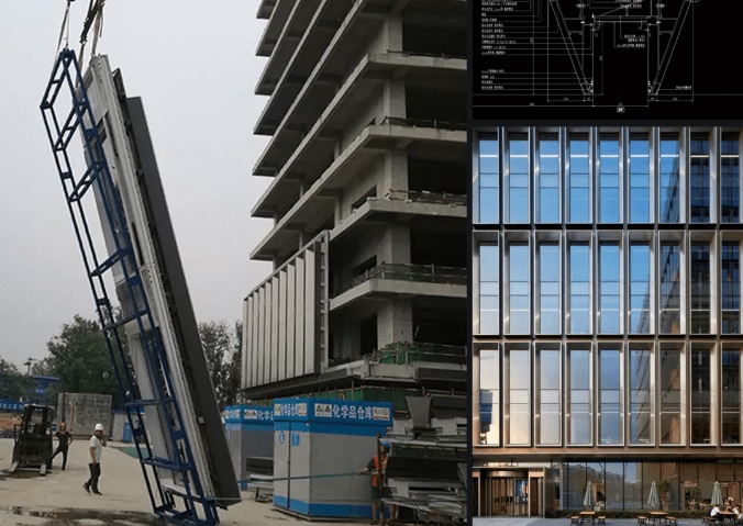 2. حائط الستارة الوحدة: يتم تجميع اللوحة والإطار المعدني (العارضة، العمود) في وحدات حائط الستارة في المصنع، ويتم دعم الإطار الذي يدعم حائط الستارة للمبنى من خلال التركيب والبناء في الموقع في شكل وحدات حائط الستارة (ارتفاع لوحة الوحدة العامة هو ارتفاع طابق واحد).
